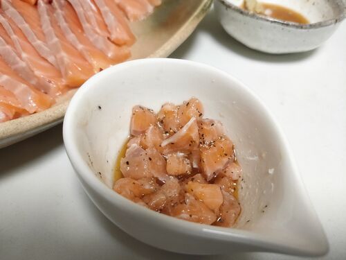 タイトルだけが全てだ。 それ以上でもそれ以下でもない。 サーモンの柵を買って端切れで拵えたサーモンユッケであるが これが完全にサーモンの刺し身を食っていた。 メジロパーマーがメジロマックイーンを破る*1ような、そんな驚きがあった(そうなの?) (…